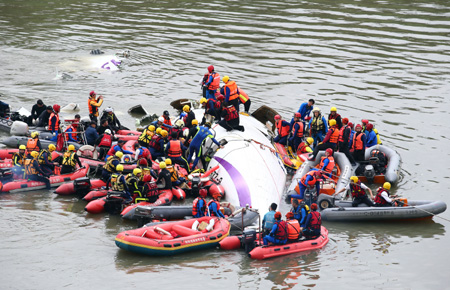 2月4日,救援人員在臺(tái)北市基隆河河面搜救。 2月4日上午,臺(tái)灣復(fù)興航空一架從臺(tái)北飛往金門的ATR-72班機(jī)在臺(tái)北市南港失聯(lián)并墜河。機(jī)上共有58人,截至4日22時(shí),臺(tái)灣復(fù)興航空班機(jī)事故共尋獲40人,送醫(yī)15人,死亡25人。旅客中有大陸乘客31名,其中已知6人罹難,3人受傷。