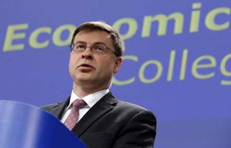 2月25日,在比利時首都布魯塞爾,歐盟委員會副主席、負責(zé)歐元與社會事務(wù)的委員東布羅夫斯基出席新聞發(fā)布會。 東布羅夫斯基當(dāng)日在新聞發(fā)布會上表示,歐委會決定同意歐元區(qū)第二大經(jīng)濟體法國推遲兩年至2017年實現(xiàn)歐盟規(guī)定的減赤目標(biāo)。