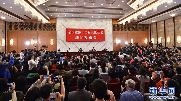 3月2日,全國政協(xié)十二屆三次會(huì)議新聞發(fā)布會(huì)在北京人民大會(huì)堂舉行,大會(huì)發(fā)言人呂新華介紹會(huì)議有關(guān)情況并回答中外記者提問。