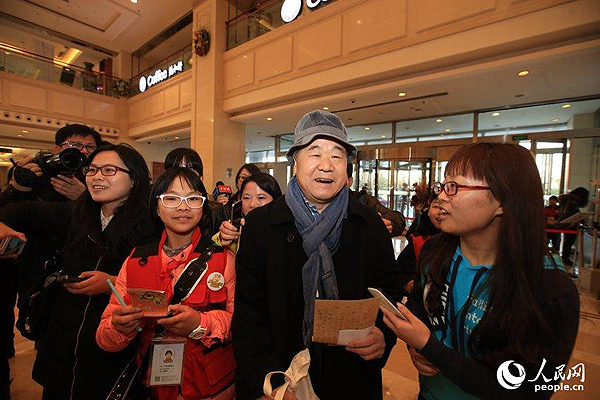 2015年3月2日,北京,莫言前來(lái)北京會(huì)議中心政協(xié)文藝組駐地報(bào)道,面對(duì)記者的“圍攻”和提問(wèn),莫言一如既往的面帶微笑,沉默不語(yǔ)。