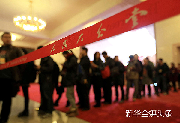 排隊(duì)干嘛呢?這是中外記者在排隊(duì)領(lǐng)取大會(huì)材料。 新華社記者 邢廣利 攝