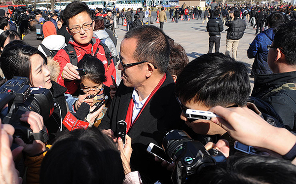 3月3日,中國(guó)人民政治協(xié)商會(huì)議第十二屆全國(guó)委員會(huì)第三次會(huì)議在北京人民大會(huì)堂開(kāi)幕。這是記者們?cè)谌嗣翊髸?huì)堂東門(mén)外廣場(chǎng)采訪全國(guó)政協(xié)委員俞敏洪。 新華網(wǎng) 翟子赫 攝