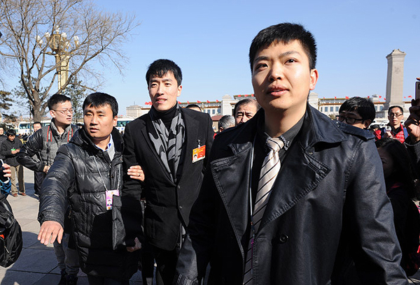 3月3日,中國人民政治協(xié)商會(huì)議第十二屆全國委員會(huì)第三次會(huì)議在北京人民大會(huì)堂開幕。這是記者們在人民大會(huì)堂東門外廣場拍攝全國政協(xié)委員劉翔。 新華網(wǎng) 翟子赫 攝