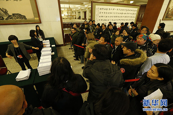 3月5日,第十二屆全國人民代表大會第三次會議在北京人民大會堂開幕。這是媒體記者排隊領取政府工作報告等文件。 新華社記者 沈伯韓 攝