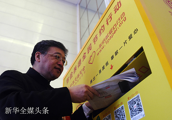 看過(guò)的報(bào)紙可以拿來(lái)獻(xiàn)愛心。這是全國(guó)政協(xié)委員何偉將看過(guò)的報(bào)紙投進(jìn)“愛心屋”。 新華社記者 楊青 攝