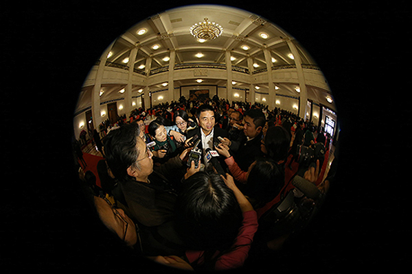 這個(gè)圓的圓心是接受采訪的全國人大代表劉永好。新華社記者 呂迅 攝