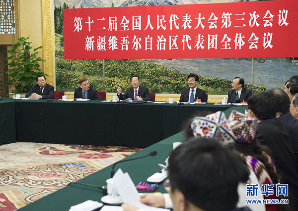3月8日,中共中央政治局常委、國務院副總理張高麗參加十二屆全國人大三次會議新疆代表團的審議。 新華社記者王曄攝