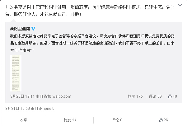 2015年3月21日,阿里巴巴官方微博轉(zhuǎn)發(fā)阿里健康官方認證微博聲明表示,“開放共享是阿里巴巴和阿里健康一貫的態(tài)度,阿里健康會延續(xù)阿里模式,只建生態(tài),做平臺。服務好他人,才能成就自己,共勉”。而其轉(zhuǎn)發(fā)的阿里健康長微博內(nèi)容則稱,阿里健康是在國家食藥監(jiān)總局指導下,進行中國藥品電子監(jiān)管碼的數(shù)據(jù)平臺建設,并且正在按照食藥監(jiān)總局的要求,逐步開放免費的數(shù)據(jù)服務。