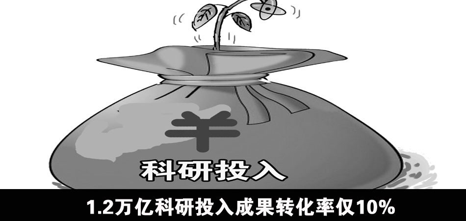 數(shù)據(jù)顯示,2013年我國(guó)全社會(huì)研發(fā)投入已達(dá)1.2萬(wàn)億元左右,其中財(cái)政科技支出5000億元,居世界前列,但原發(fā)改委副主任張曉強(qiáng)表示,我國(guó)科技成果轉(zhuǎn)化率僅為10%,遠(yuǎn)低于發(fā)達(dá)國(guó)家40%的水平。