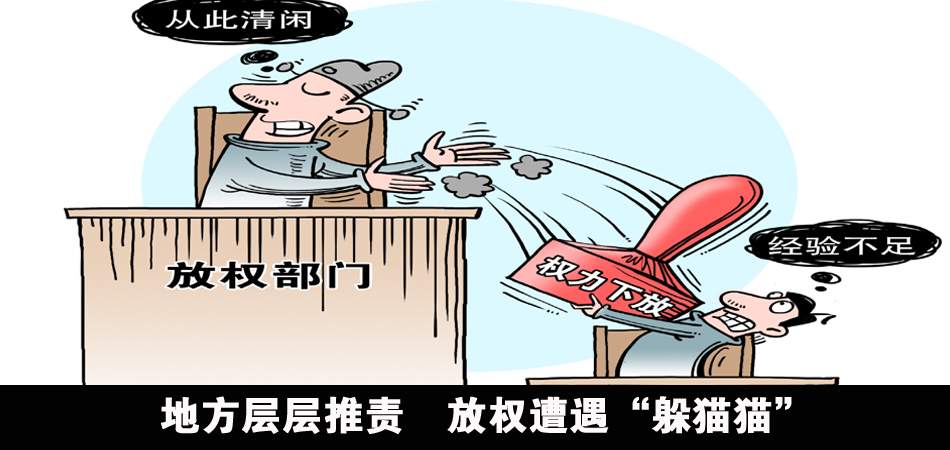 由于怕?lián)?zé),不少從上頭“接權(quán)”的部門辦事人員常以業(yè)務(wù)不熟悉為由,對接手的審批事項(xiàng)拖著不辦,或是跟上級反復(fù)請示,有的還必須要單位一把手簽字才能過關(guān)。部門之間層層“推權(quán)”使得放權(quán)被堵在“最后一公里”上,一些企業(yè)主苦不堪言。
