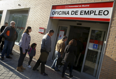 4月6日,在西班牙首都馬德里,人們排隊等待進入一間政府就業(yè)介紹所。 當天,西班牙勞工部公布的數(shù)據(jù)顯示,3月份西班牙登記失業(yè)人數(shù)為445萬,比前一個月降低1.3%。