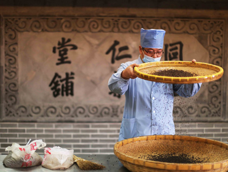 圖為北京同仁堂的工作人員正在用傳統(tǒng)工藝制藥。