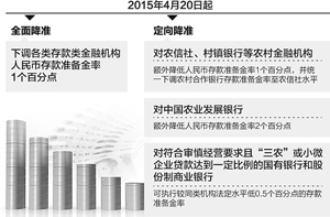 4月19日,央行宣布自20日起下調(diào)各類存款類金融機(jī)構(gòu)人民幣存款準(zhǔn)備金率1個(gè)百分點(diǎn)。在此基礎(chǔ)上,為進(jìn)一步增強(qiáng)金融機(jī)構(gòu)支持結(jié)構(gòu)調(diào)整的能力,加大對小微企業(yè)、“三農(nóng)”以及重大水利工程建設(shè)等的支持力度,自4月20日起對農(nóng)信社、村鎮(zhèn)銀行等農(nóng)村金融機(jī)構(gòu)額外降低人民幣存款準(zhǔn)備金率1個(gè)百分點(diǎn),并統(tǒng)一下調(diào)農(nóng)村合作銀行存款準(zhǔn)備金率至農(nóng)信社水平;對中國農(nóng)業(yè)發(fā)展銀行額外降低人民幣存款準(zhǔn)備金率2個(gè)百分點(diǎn);對符合審慎經(jīng)營要求且“三農(nóng)”或小微企業(yè)貸款達(dá)到一定比例的國有銀行和股份制商業(yè)銀行可執(zhí)行較同類機(jī)構(gòu)法定水平低0.5個(gè)百分點(diǎn)的存款準(zhǔn)備金率。