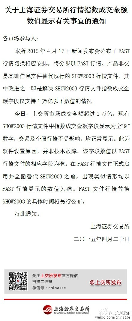 對此,上交所發(fā)布《關于上海證券交易所行情指數(shù)成交金額數(shù)值顯示有關事宜的通知》。