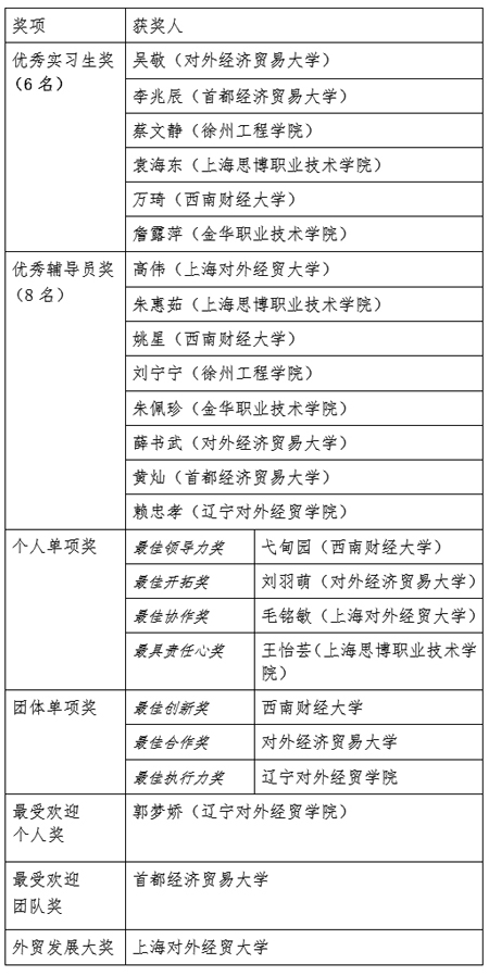 活動還頒發(fā)了“外貿發(fā)展大獎”、“最佳創(chuàng)新團隊”、“最佳合作團隊”、“最佳領導力獎”、“最佳開拓獎”等2014年度12335商務知識競賽復賽和決賽相關獎項,來自上海對外經貿大學、西南財經大學、對外經貿大學等多所大學的學生團隊和個人獲得獎勵。