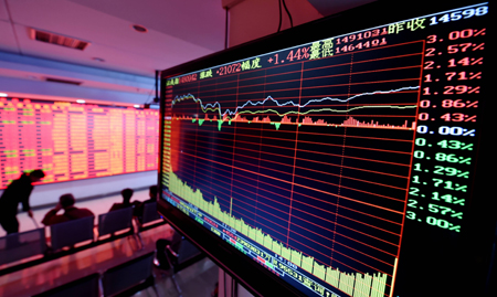 4月27日,上證綜指開盤重返4400點,此后穩(wěn)步上行,尾盤觸及4529.73點的七年新高后,以4527.40點報收,較前一交易日大漲3.04%。深證成指走勢明顯弱于滬指,收盤報14809.42點,漲210.73點,漲幅為1.44%。 圖為當(dāng)日股民在河南省洛陽市一家證券營業(yè)廳關(guān)注股市行情。