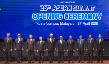 4月27日,在馬來(lái)西亞吉隆坡,與會(huì)領(lǐng)導(dǎo)人在東盟領(lǐng)導(dǎo)人會(huì)議開(kāi)幕式上合影。當(dāng)日,第26屆東盟領(lǐng)導(dǎo)人會(huì)議在馬來(lái)西亞吉隆坡開(kāi)幕。會(huì)議的主要目標(biāo)是確保東盟共同體在今年年底前如期建成,商討制定東盟在2015年后的發(fā)展愿景。