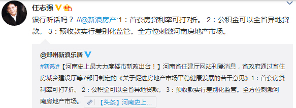 對(duì)于此次出臺(tái)的河南史上最大力度的樓市新政,知名地產(chǎn)商任志強(qiáng)微博中給出評(píng)論:“銀行聽(tīng)話嗎?”