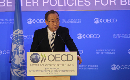 4月28日,聯(lián)合國(guó)秘書長(zhǎng)潘基文在經(jīng)濟(jì)合作與發(fā)展組織位于巴黎的總部發(fā)表演講。潘基文表示,現(xiàn)有的國(guó)際投融資機(jī)制已難以滿足各國(guó)可持續(xù)發(fā)展需要,國(guó)際社會(huì)應(yīng)加強(qiáng)合作,爭(zhēng)取達(dá)成新的協(xié)議,以改善現(xiàn)有的國(guó)際投融資機(jī)制,促進(jìn)可持續(xù)發(fā)展。