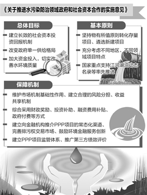 財政部和環(huán)保部日前聯(lián)合發(fā)布《關(guān)于推進水污染防治領(lǐng)域政府和社會資本合作的實施意見》(以下簡稱《意見》),對于下一步水污染防治領(lǐng)域政府和社會資本合作(PPP)項目操作流程作出明確規(guī)范。記者從相關(guān)部門獲悉,從目前情況來看,下一步國家將細化社會資本投資環(huán)保治理領(lǐng)域的鼓勵措施,包括財政、稅收、貸款優(yōu)惠等內(nèi)容。與此同時,環(huán)保部將完善水污染防治領(lǐng)域特許經(jīng)營管理制度,降低準(zhǔn)入門檻,清理審批限制,拓寬社會資本投入渠道。