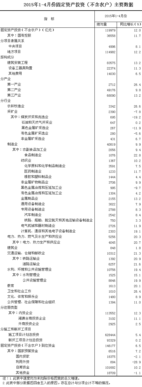 2015年1-4月份,全國(guó)固定資產(chǎn)投資(不含農(nóng)戶)119979億元,同比名義增長(zhǎng)12.0%,增速比1-3月份回落1.5個(gè)百分點(diǎn)。從環(huán)比速度看,4月份固定資產(chǎn)投資(不含農(nóng)戶)增長(zhǎng)0.89%。