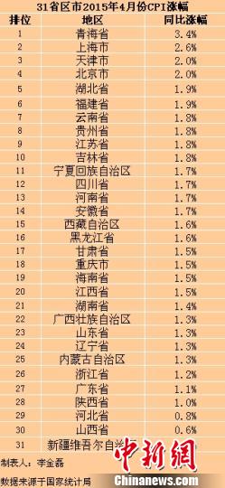 在這31個(gè)省份中,青海4月份CPI同比漲幅最高,為3.4%,也是全國(guó)僅有的CPI漲幅在“3”時(shí)代的地區(qū)。新疆漲幅最低,僅為0.2%。