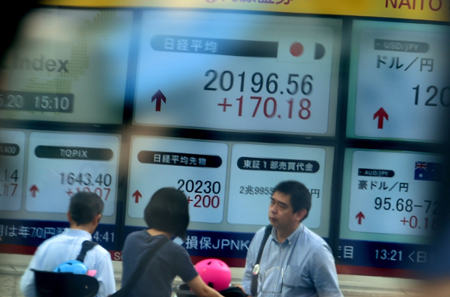 5月20日,在經(jīng)濟(jì)數(shù)據(jù)利好、日元對(duì)美元匯率下跌等多重利好因素提振下,日本東京股市高開高走,日經(jīng)225種股票平均價(jià)格指數(shù)實(shí)現(xiàn)4連陽,創(chuàng)2000年4月以來最高收盤點(diǎn)位。至收盤時(shí),日經(jīng)股指上漲170.18點(diǎn),收于20196.56點(diǎn),漲幅為0.85%。圖為行人站在東京證券交易所外的電子股指顯示屏前。