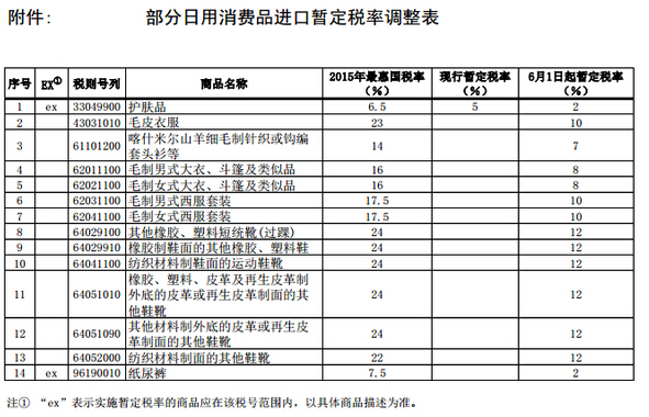 記者25日從財(cái)政部網(wǎng)站獲悉,國(guó)務(wù)院關(guān)稅稅則委員會(huì)發(fā)布通知,以暫定稅率方式降低護(hù)膚品、西裝、短統(tǒng)靴、紙尿褲等產(chǎn)品的進(jìn)口關(guān)稅,調(diào)整自2015年6月1日起實(shí)施。