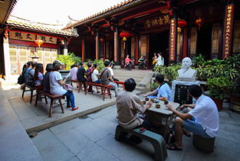 外來(lái)游客與本地市民在五店市的莊氏祠堂共聽(tīng)南音一曲。