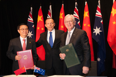6月17日,在澳大利亞首都堪培拉國家美術(shù)館,中國商務(wù)部部長高虎城(左)和澳大利亞貿(mào)易與投資部部長安德魯·羅布(右)在分別代表兩國政府正式簽署《中華人民共和國政府和澳大利亞政府自由貿(mào)易協(xié)定》后與澳大利亞總理托尼·阿博特合影。根據(jù)協(xié)定,在貨物貿(mào)易領(lǐng)域,雙方各有占出口貿(mào)易額85.4%的產(chǎn)品將在協(xié)定生效時立即實(shí)現(xiàn)零關(guān)稅!