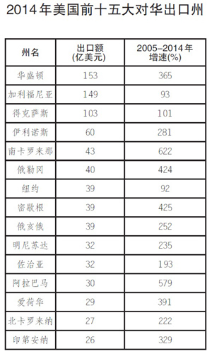 2014年,美國對中國的出口額總計為1200億美元,中國成為繼美國的鄰國和伙伴國加拿大和墨西哥之后,美國商品的第三大出口目的地。