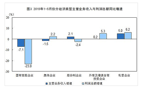 1-5月份,在規(guī)模以上工業(yè)企業(yè)中,國(guó)有控股企業(yè)實(shí)現(xiàn)利潤(rùn)總額4603.3億元,同比下降23%;集體企業(yè)實(shí)現(xiàn)利潤(rùn)總額192.6億元,增長(zhǎng)2.2%;股份制企業(yè)實(shí)現(xiàn)利潤(rùn)總額14569.1億元,下降2.4%;外商及港澳臺(tái)商投資企業(yè)實(shí)現(xiàn)利潤(rùn)總額5819.4億元,增長(zhǎng)5.3%;私營(yíng)企業(yè)實(shí)現(xiàn)利潤(rùn)總額7857.8億元,增長(zhǎng)6.2%。