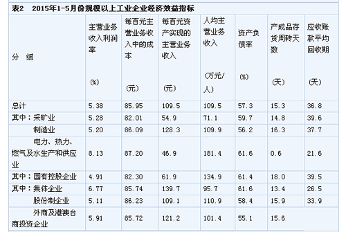 1-5月份,規(guī)模以上工業(yè)企業(yè)主營(yíng)業(yè)務(wù)收入利潤(rùn)率為5.38%,每百元主營(yíng)業(yè)務(wù)收入中的成本為85.95元,每百元資產(chǎn)實(shí)現(xiàn)的主營(yíng)業(yè)務(wù)收入為109.5元,人均主營(yíng)業(yè)務(wù)收入為109.5萬(wàn)元,產(chǎn)成品存貨周轉(zhuǎn)天數(shù)為15.3天,應(yīng)收賬款平均回收期為36.8天。5月末,資產(chǎn)負(fù)債率為57.3%。