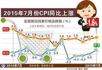 ??? 受國內(nèi)“豬周期”及國際大宗商品價(jià)格暴跌影響,我國居民消費(fèi)價(jià)格指數(shù)(CPI)和工業(yè)生產(chǎn)者出廠價(jià)格指數(shù)(PPI)走勢(shì)進(jìn)一步分化。國家統(tǒng)計(jì)局9日公布數(shù)據(jù)顯示,7月我國CPI同比上漲1.6%,漲幅連續(xù)第二個(gè)月擴(kuò)大,較6月增加0.2個(gè)百分點(diǎn),創(chuàng)下9個(gè)月來新高;PPI同比下降5.4%,跌幅連續(xù)第二個(gè)月擴(kuò)大,較6月降低0.6個(gè)百分點(diǎn),連續(xù)第41個(gè)月負(fù)增長。