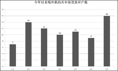 《經(jīng)濟參考報》記者根據(jù)中債登數(shù)據(jù)統(tǒng)計,在今年新增的79家新增賬戶中,16家為7月一個月“貢獻”,剩余63家在1至6月依次分布為7家、14家、12家、10家、11家和9家。從投資規(guī)模上看,今年托管在中債登的境外機構(gòu)債券投資額高達537億元,其中超半數(shù)為7月新增額,達284.5億元。