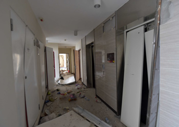 8月13日拍攝的爆炸地點(diǎn)附近的萬科清水藍(lán)灣小區(qū)受損情況,電梯和門已經(jīng)被毀壞?!⌒氯A社記者 岳月偉/攝 |