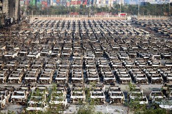 8月13日,在天津海濱爆炸現(xiàn)場,數(shù)千輛車輛被燒毀,損失巨大?!⌒氯A社記者 才揚(yáng)/攝 |