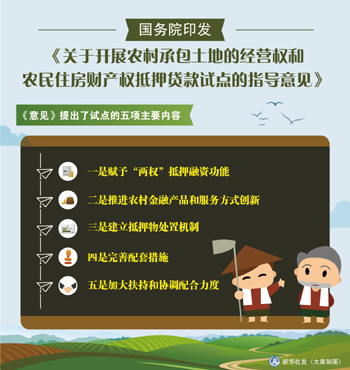 ??? 農(nóng)村金融制度和農(nóng)村土地產(chǎn)權(quán)制度的一項重要改革創(chuàng)新——農(nóng)民承包土地的經(jīng)營權(quán)和農(nóng)民住房的財產(chǎn)權(quán)等“兩權(quán)”作為抵押物向金融機構(gòu)貸款終于迎來了頂層設(shè)計。國務(wù)院日前正式發(fā)布了《國務(wù)院關(guān)于開展農(nóng)村承包土地的經(jīng)營權(quán)和農(nóng)民住房財產(chǎn)權(quán)抵押貸款試點的指導(dǎo)意見》(以下簡稱《意見》),要求試點地區(qū)穩(wěn)妥有序開展“兩權(quán)”抵押貸款業(yè)務(wù),有效盤活農(nóng)村資源、資金、資產(chǎn),增加農(nóng)業(yè)生產(chǎn)中長期和規(guī)?;?jīng)營的資金投入,為穩(wěn)步推進農(nóng)村土地制度改革提供經(jīng)驗。