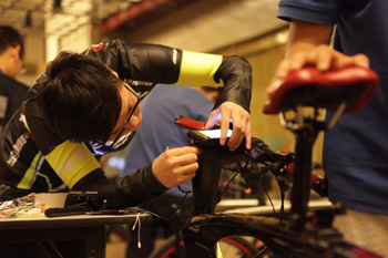 近日,樂(lè)視體育的工程師在調(diào)試由樂(lè)視體育和天津飛鴿自行車廠合作研發(fā)生產(chǎn)的“超級(jí)自行車”?! ⌒氯A社發(fā) |