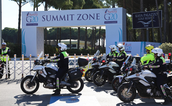 11月11日,在土耳其安塔利亞,警察在二十國(guó)集團(tuán)領(lǐng)導(dǎo)人第十次會(huì)議主會(huì)場(chǎng)區(qū)域內(nèi)執(zhí)勤?!∮浾?鄒樂/攝 |