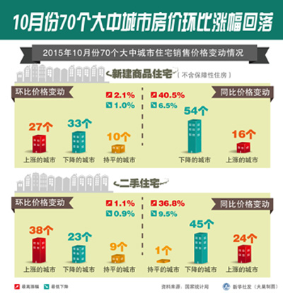 國(guó)家統(tǒng)計(jì)局10月份70個(gè)大中城市住宅銷(xiāo)售價(jià)格變動(dòng)情況顯示,70個(gè)大中城市中,新建商品住宅價(jià)格下降的城市有33個(gè),較9月增加了12個(gè)。這意味著,自今年2月起,新建商品住宅價(jià)格環(huán)比下降城市數(shù)量持續(xù)減少7個(gè)月后再次上升。