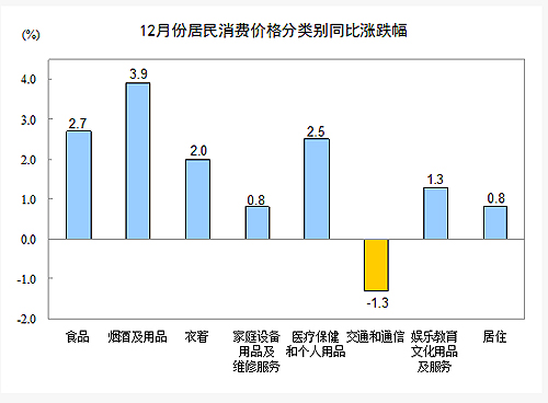 12月份,非食品價(jià)格同比上漲1.1%。其中,煙酒及用品、醫(yī)療保健和個(gè)人用品、衣著、娛樂教育文化用品及服務(wù)、家庭設(shè)備用品及維修服務(wù)、居住價(jià)格分別上漲3.9%、2.5%、2.0%、1.3%、0.8%和0.8%;交通和通信價(jià)格下降1.3%。