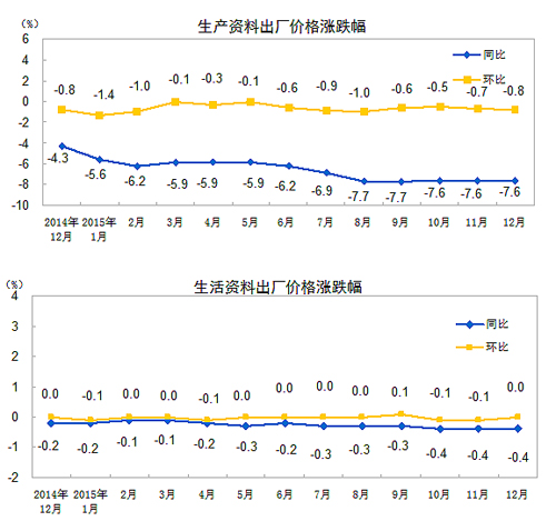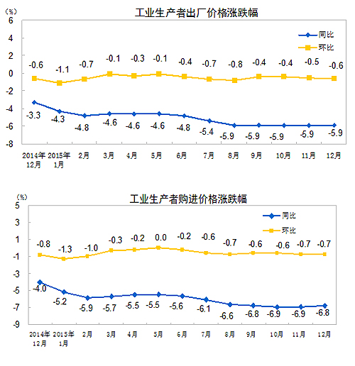 2015年12月份,全國(guó)工業(yè)生產(chǎn)者出廠價(jià)格環(huán)比下降0.6%,同比下降5.9%。工業(yè)生產(chǎn)者購(gòu)進(jìn)價(jià)格環(huán)比下降0.7%,同比下降6.8%。2015年,工業(yè)生產(chǎn)者出廠價(jià)格同比下降5.2%,工業(yè)生產(chǎn)者購(gòu)進(jìn)價(jià)格同比下降6.1%。