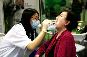 5月4日,一名參觀者(右)在第五屆中國國際養(yǎng)老服務業(yè)博覽會現場體驗醫(yī)療健康服務。 新華社記者 潘旭/攝? |