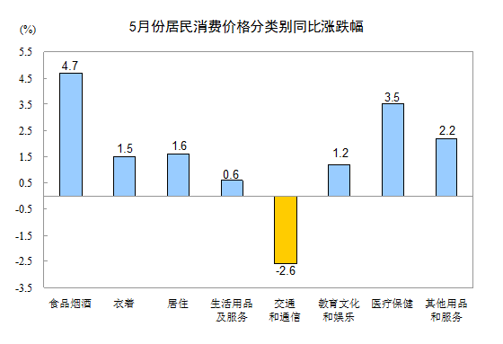 5月份,其他七大類價格同比六漲一降。其中,醫(yī)療保健、其他用品和服務、居住、衣著、教育文化和娛樂、生活用品及服務價格分別上漲3.5%、2.2%、1.6%、1.5%、1.2%、0.6%;交通和通信價格下降2.6%。
