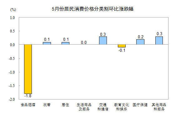 5月份,全國居民消費價格總水平環(huán)比下降0.5%。其中,城市下降0.5%,農村下降0.4%;食品價格下降2.7%,非食品價格上漲0.1%;消費品價格下降0.7%,服務價格持平。