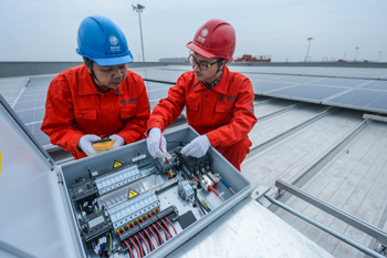 工作人員在浙江省德清縣升華臨杭物流園區(qū)檢查屋頂光伏發(fā)電設(shè)備。 新華社記者 徐昱/攝? |