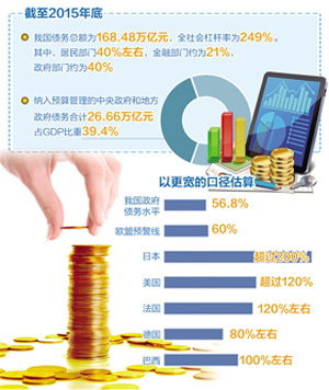 據(jù)統(tǒng)計(jì),截至2015年末,我國(guó)納入預(yù)算管理的中央政府債務(wù)10.66萬億元,地方政府債務(wù)16萬億元,合計(jì)政府債務(wù)26.66萬億元,占GDP比重為39.4%。如果把地方融資平臺(tái)加進(jìn)來,以更寬的口徑估算,政府債務(wù)水平達(dá)到56.8%,仍低于歐盟60%的警戒線,也低于當(dāng)前主要市場(chǎng)經(jīng)濟(jì)國(guó)家和新興市場(chǎng)國(guó)家水平,比如,日本超過200%、美國(guó)超過120%、法國(guó)120%左右、德國(guó)80%左右、巴西100%左右。