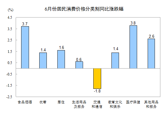 6月份,其他七大類價格同比六漲一降。其中,醫(yī)療保健、其他用品和服務(wù)、居住、衣著、教育文化和娛樂、生活用品及服務(wù)價格分別上漲3.8%、2.6%、1.6%、1.4%、1.4%、0.6%;交通和通信價格下降1.8%。