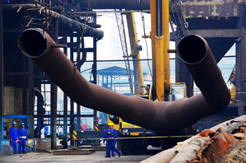 施工人員對(duì)河北霸州市新利鋼鐵公司的450立方米高爐進(jìn)行拆除。 新華社發(fā)(金志超攝)? |